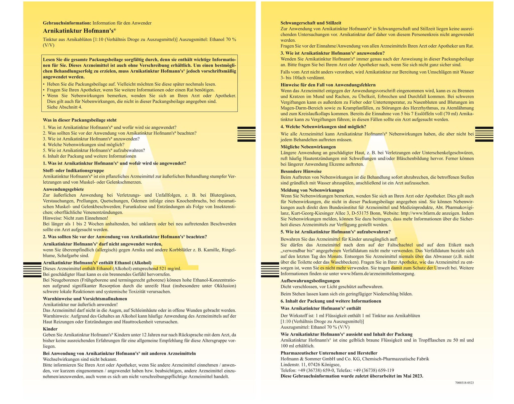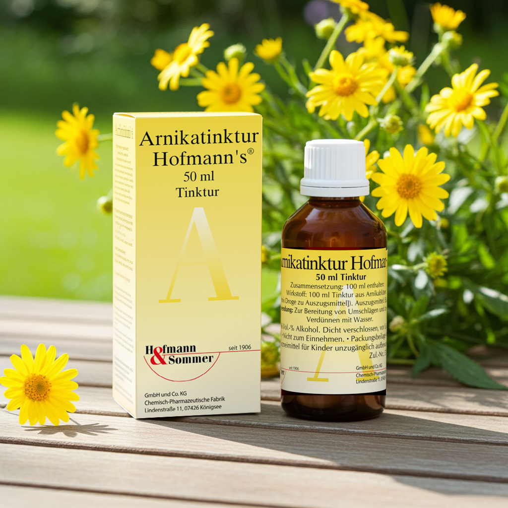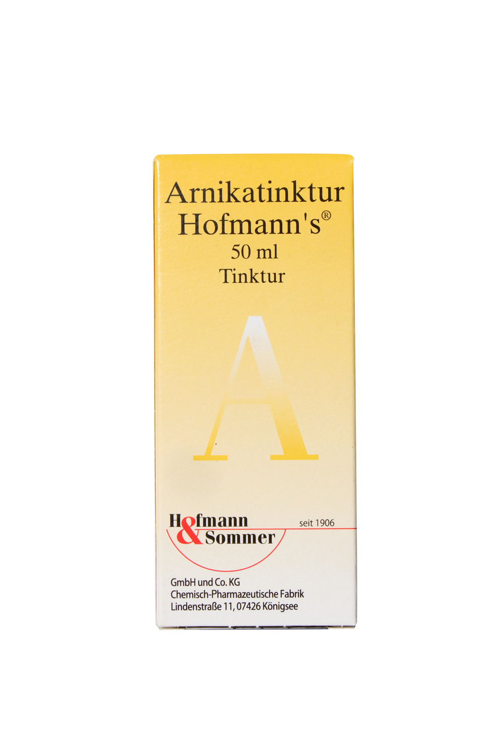 Pflichtangaben: Arnikatinktur Hofmann´s®; Wirkstoff: Arnikatinktur; Anwendungsgebiete: Zur äußerlichen Anwendung bei Verletzungs- und Unfallfolgen, z.B. bei Blutergüssen, Verstauchungen, Prellungen, Quetschungen, Ödemen infolge eines Knochenbruchs, bei rheumatischen Muskel- und Gelenkbeschwerden; Furunkulose und Entzündungen als Folge von Insektenstichen; oberflächliche Venenentzündungen. Nicht zum Einnehmen! Bei unklaren, länger andauernden oder neu auftretenden Beschwerden sollte ein Arzt aufgesucht werden. Hinweise: Nur äußerlich anwenden! Aufgrund des Gehaltes an Alkohol kann häufige Anwendung auf der Haut Reizungen oder Entzündungen und Hauttrockenheit verursachen.