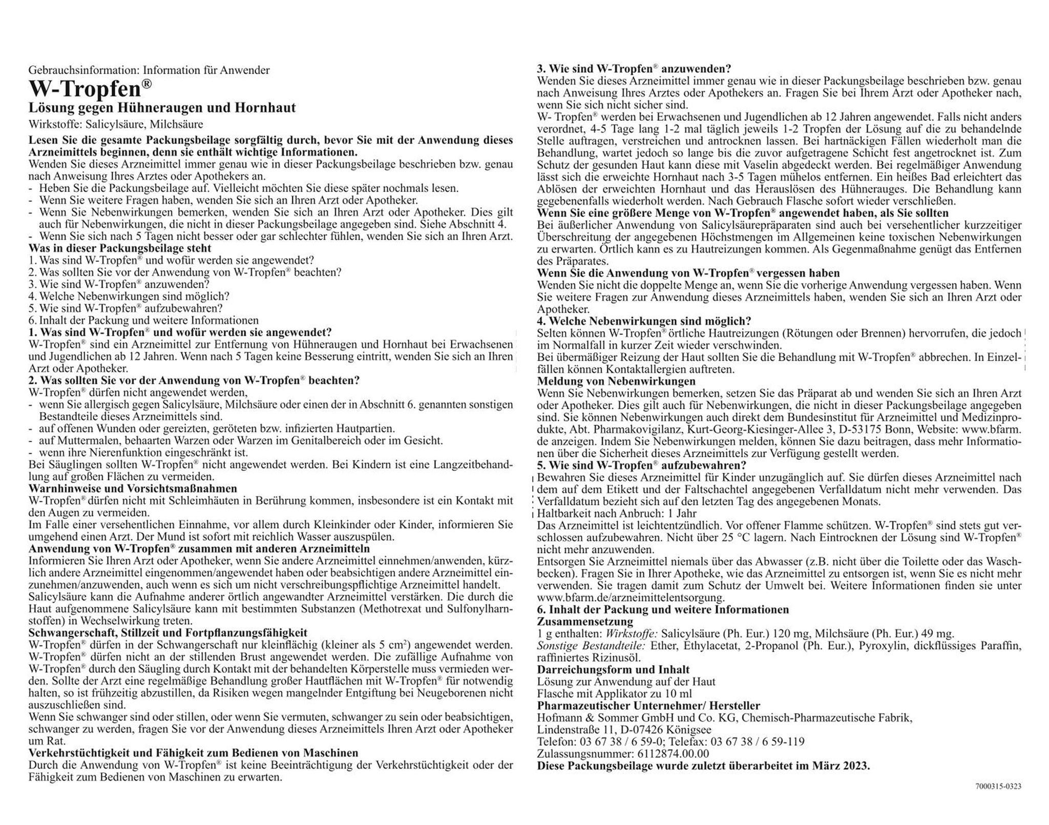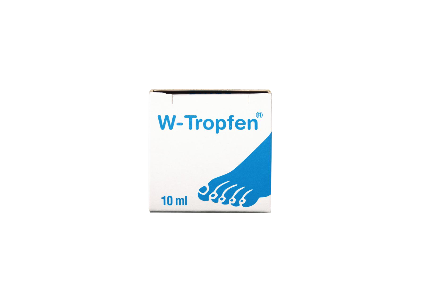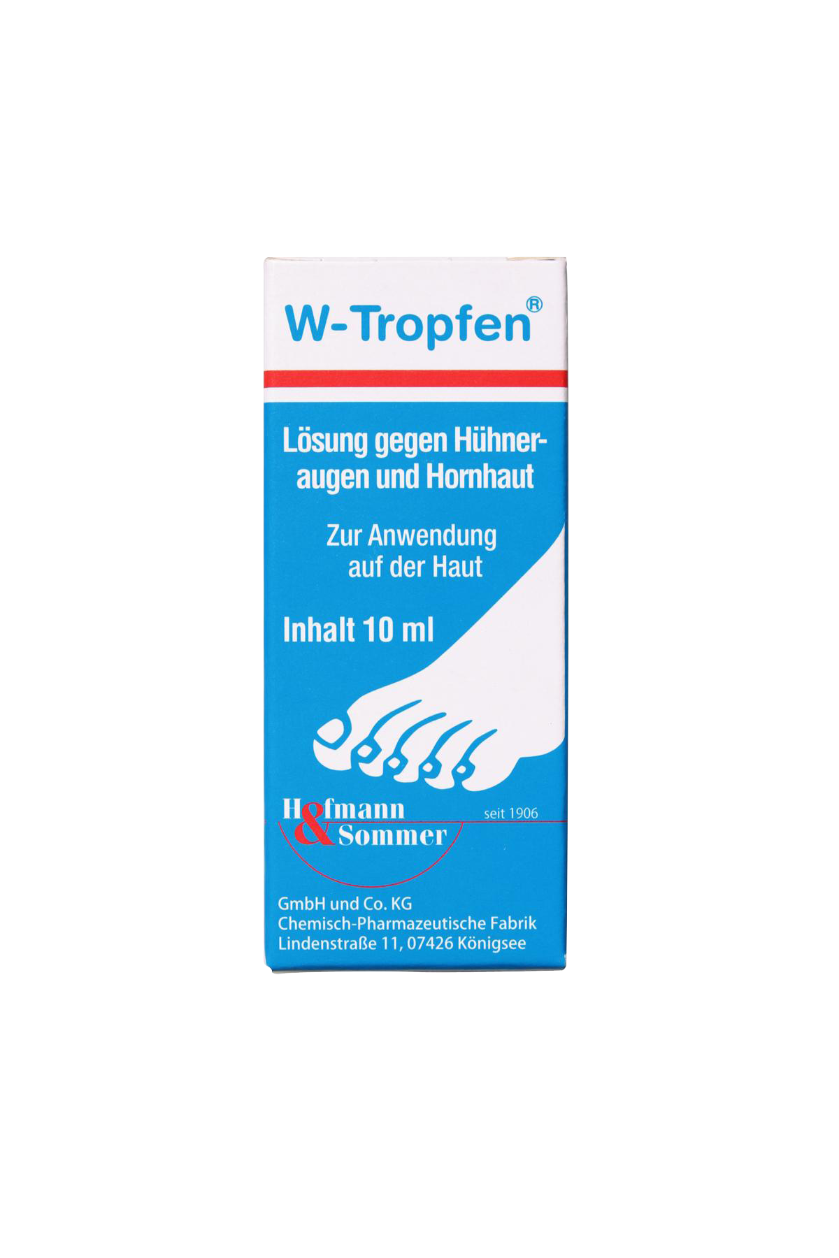 Pflichtangaben: W-Tropfen® Lösung gegen Hühneraugen und Hornhaut; Zusammensetzung: 1 g enthält: Wirkstoffe: Salicylsäure (Ph.Eur.) 120 mg, Milchsäure (Ph.Eur.) 49 mg; sonstige Bestandteile: Ether, Ethylacetat, 2-Propanol (Ph. Eur.), Pyroxylin, dickflüssiges Paraffin, raffiniertes Rizinusöl; Anwendungsgebiete: Entfernung von Hühneraugen und Hornhaut; Gegenanzeigen: Überempfindlichkeit gegenüber einen der Wirkstoffe oder einen der sonstigen Bestandteile sowie bei eingeschränkter Nierenfunktion. W-Tropfen® sollten nicht auf offene Wunden oder gereizte, gerötete bzw. infizierte Hautpartien, auf Muttermale, auf behaarte Warzen, Warzen im Genitalbereich oder im Gesicht aufgetragen werden. In der Schwangerschaft nur kleinflächig (kleiner 5 cm²) anwenden. Eine bestimmungsgemäße Behandlung während der Stillzeit ist möglich, wenn eine Behandlung im Brustbereich und die zufällige Aufnahme durch den Säugling vermieden werden. W-Tropfen® sollten nicht bei Säuglingen und nicht zur großflächigen Langzeitbehandlung bei Kindern angewendet werden. Nebenwirkungen: Selten: örtliche Hautreizungen, die nach kurzer Zeit wieder verschwinden; in Einzelfällen: Kontaktallergien; Hinweise: Nur zur äußeren Anwendung. Nicht auf Schleimhäuten und nicht am Auge anwenden. Pharmazeutischer Unternehmer: Hofmann & Sommer GmbH und Co. KG, Chemisch-Pharmazeutische Fabrik, Lindenstraße 11, 07426 Königsee.