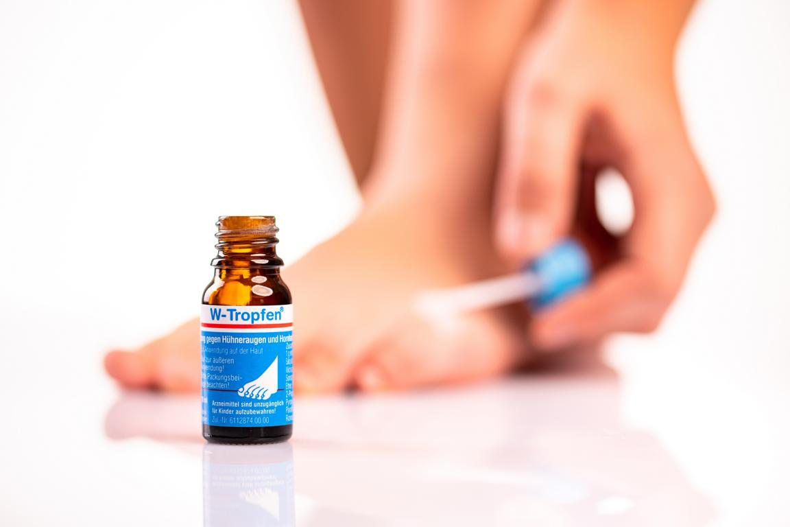 W-Tropfen® werden mit dem integrierten Applikator auf die betroffenen Hautpartien aufgetragen. Nach vier bis fünf Tagen veranlassen sie eine Abschälung der Haut an den behandelten Stellen. Die erweichte Hornhaut oder das Hühnerauge lässt sich dann mühelos entfernen.