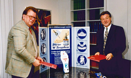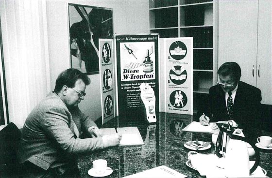 Die Bilder zeigen die Unterzeichnung des Vertrages der Übernahme der W-Tropfen am 01.12.1998 durch die Geschäftsführer von Whitehall-Much, Herrn Kube (rechts) und Hofmann&SOmmer, Herrn Dr. Strätling (links)