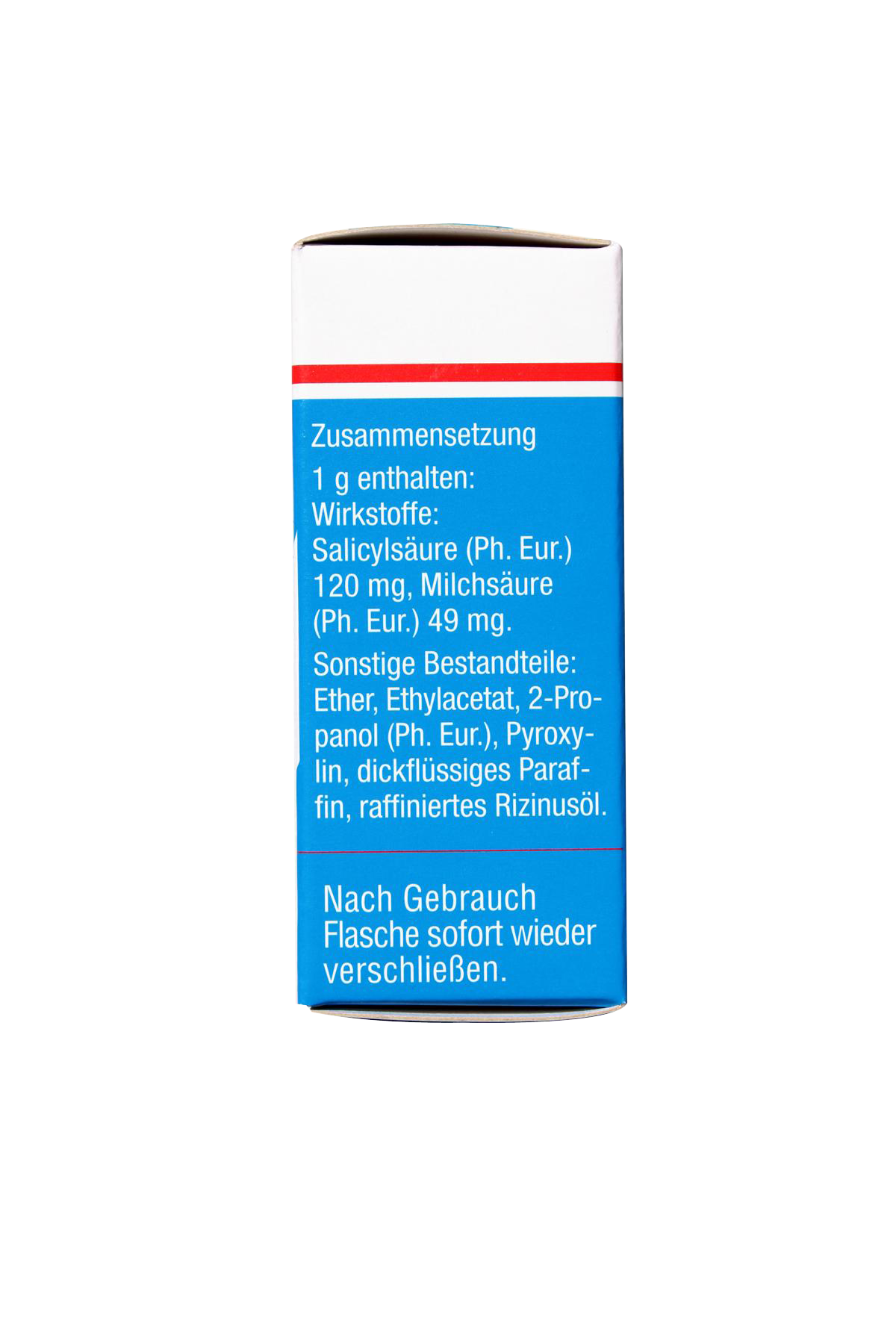Inhaltsstoffe: Ether (Diethylether), Salicylsäure, Milchsäure, Ethylacetat (Essigsäureethylester bzw. Essigester), 2-Propanol (Isopropanol bzw. Isopropylalkohol), Pyroxylin (Kollodiumwolle bzw. Schießbaumwolle), Paraffin, Rizinusöl