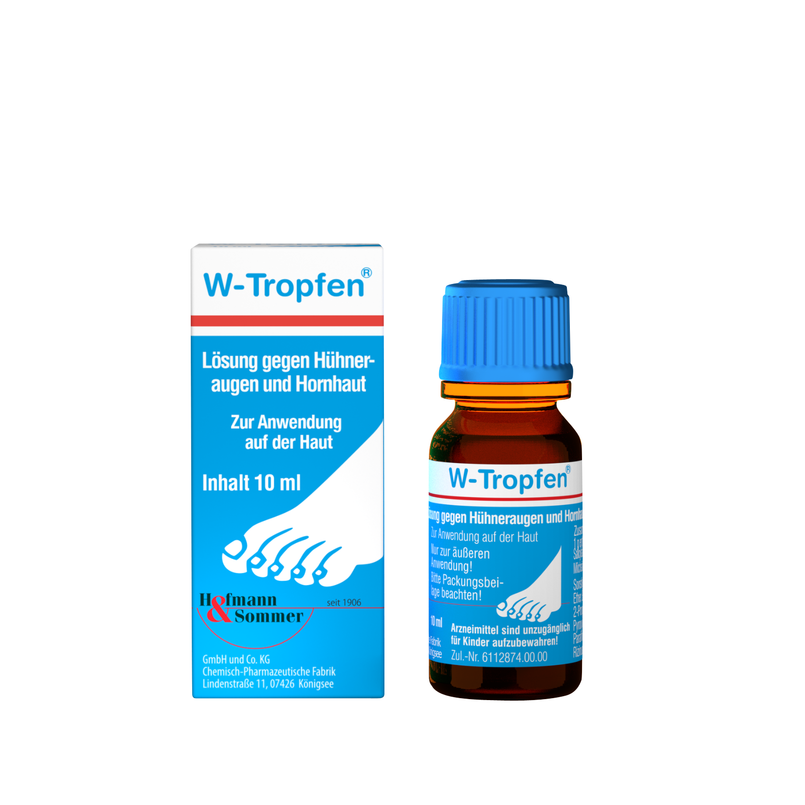 W-Tropfen® aus dem Hause Hofmann & Sommer ist die bewährte Lösung gegen Hornhaut und Hühneraugen. Seit fast 100 Jahren wird die Wirkstoffkombination aus Salicylsäure und Milchsäure gegen Verhornungen der Haut eingesetzt.